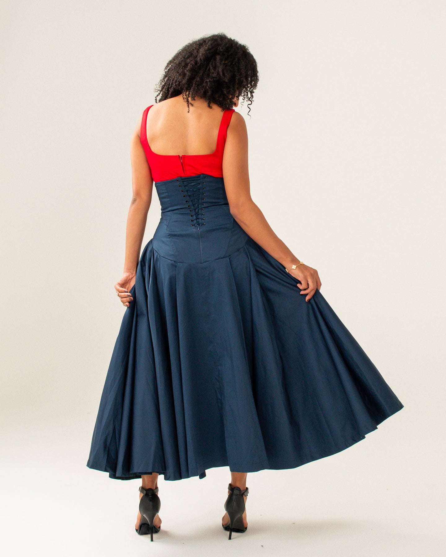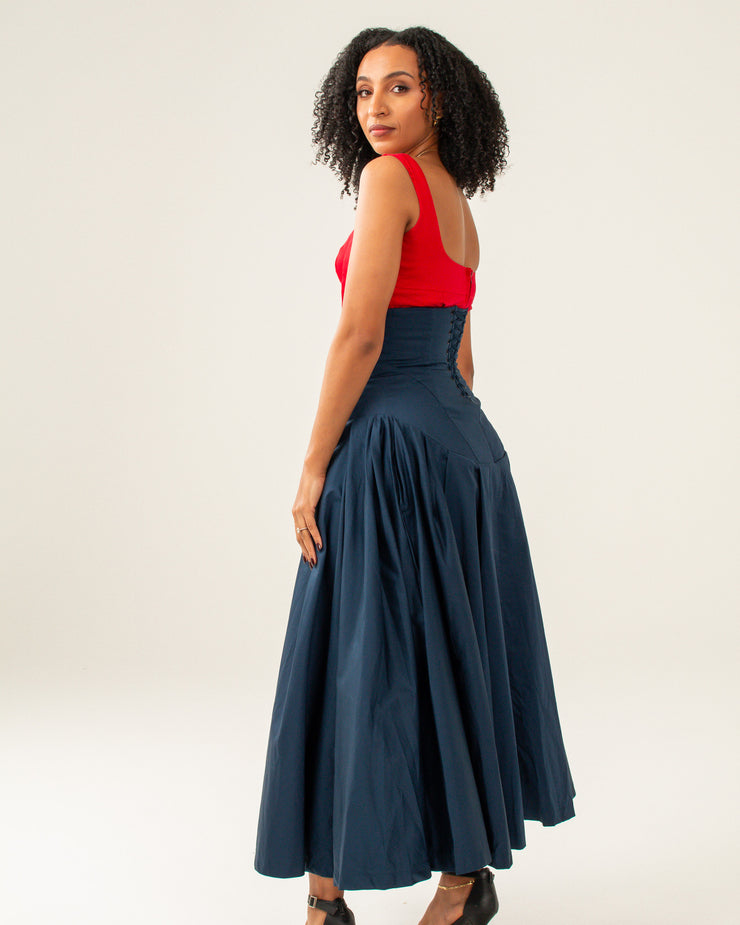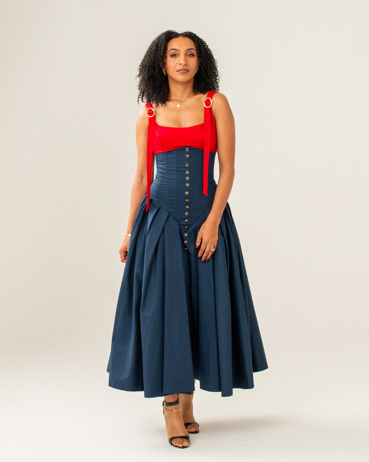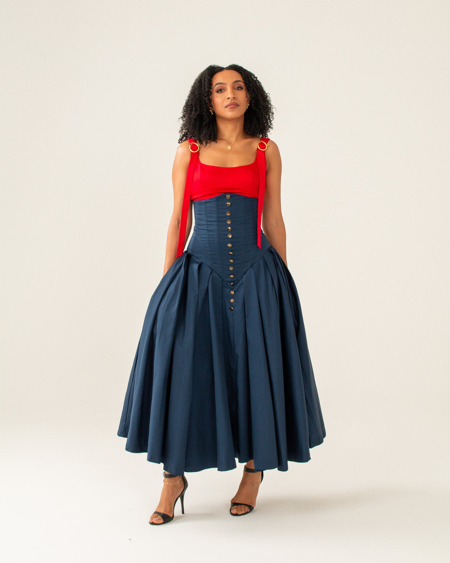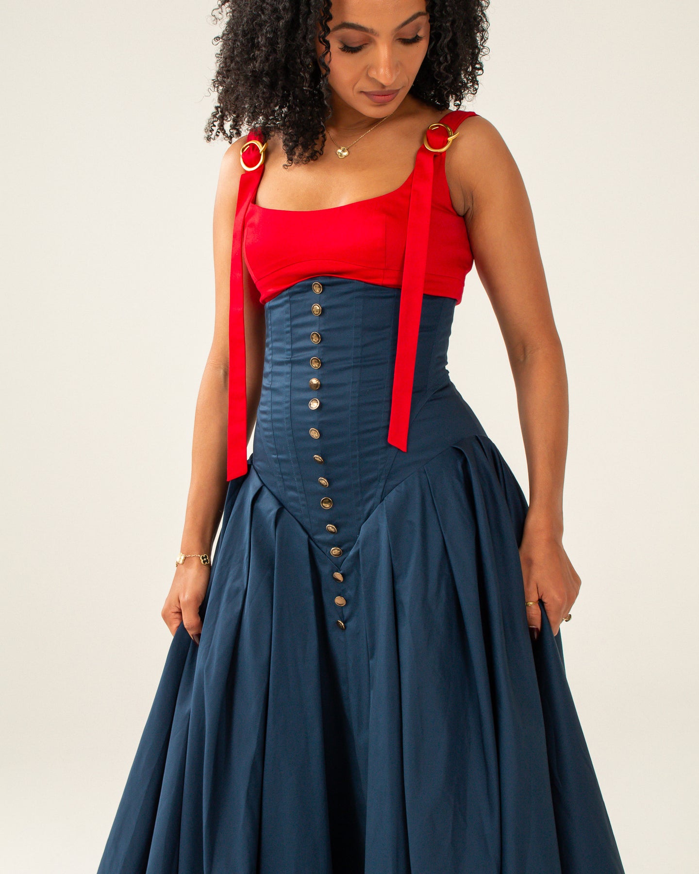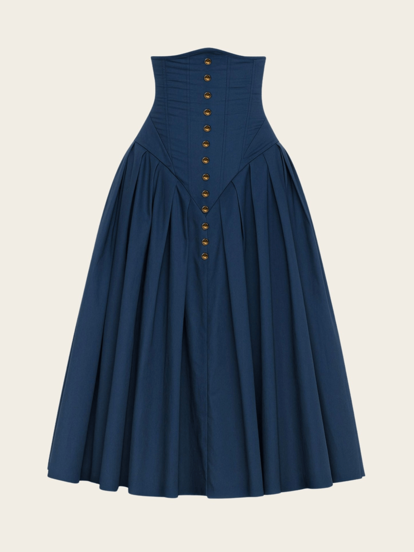 Command the room with the timeless, seasonless masterpiece that is the Sade Underbust Corset Skirt. Expertly constructed from 100% premium cotton, this piece features a sculpting corset, adjustable lacing back, antique bronze buttons, hidden side pockets, and voluminous full skirt. The details makes it an enduring investment for every wardrobe and all seasons.